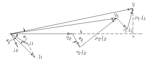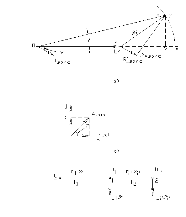 Cu i1 si i2 s-au notat curentii celor doua sarcini concentrate, iar φ1 si φ2 reprezinta defazajul dintre acesti curenti si tensiunile care ii determina, U1 si U2; cu r si x s-au notat parametrii unui tronson al retelei.
